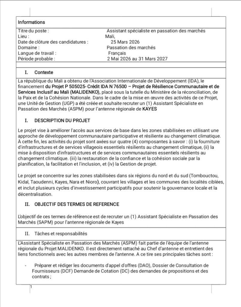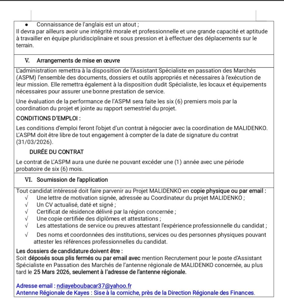 AVIS DE RECRUTEMENT POUR UN ASPM POUR LA REGION DE KAYES ACTUALITE MALIDENKO 12 mars 202612 mars 2026adminLeave a Comment on AVIS DE RECRUTEMENT POUR UN ASPM POUR LA REGION DE KAYES